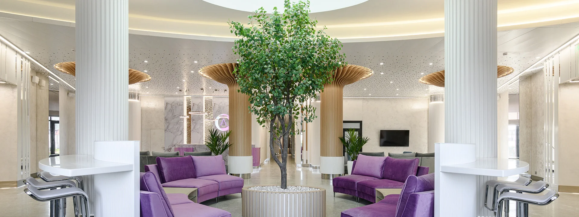 В каждом доме создан авторский холл со своей уникальной дизайнерской концепцией. Пространства отличаются интерьером и разнообразным функциональным наполнением. Неизменным всегда остаются безупречный сервис, высокая концентрация эстетики и небывалое качество жизни. Отдохните в лаундж-зоне с видом на Волгу, проведите созвон в коворкинге или насладитесь любимым напитком.