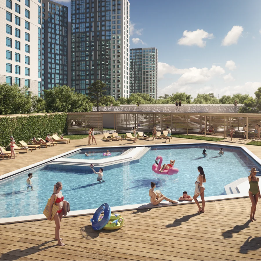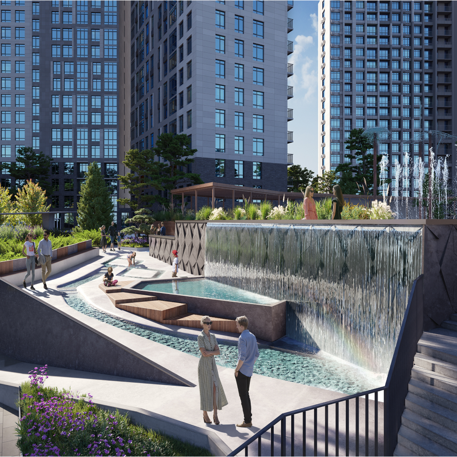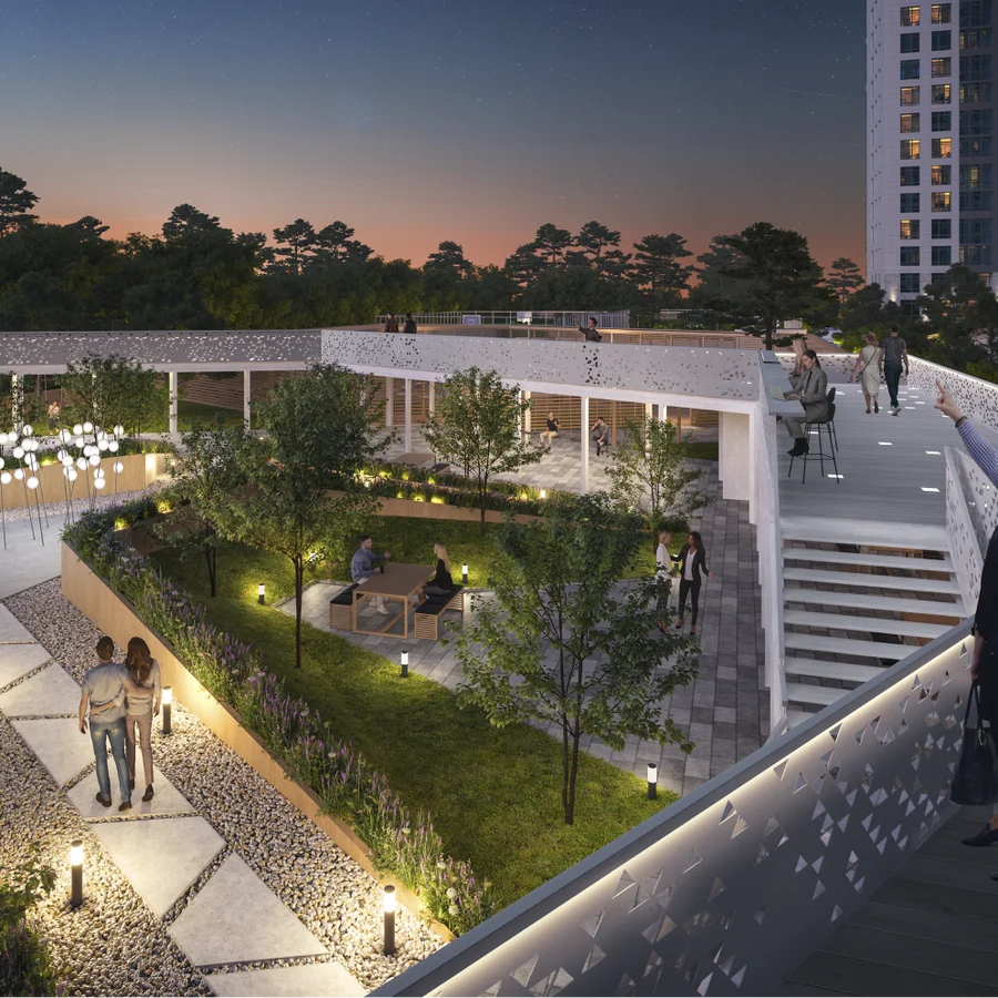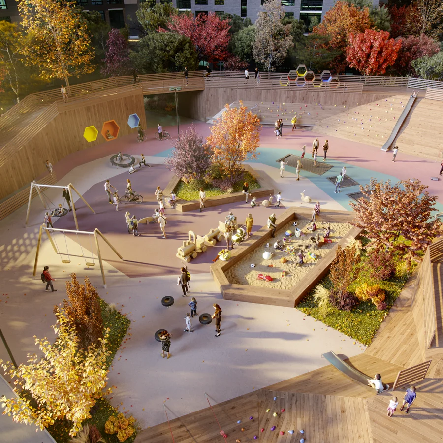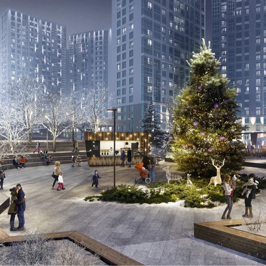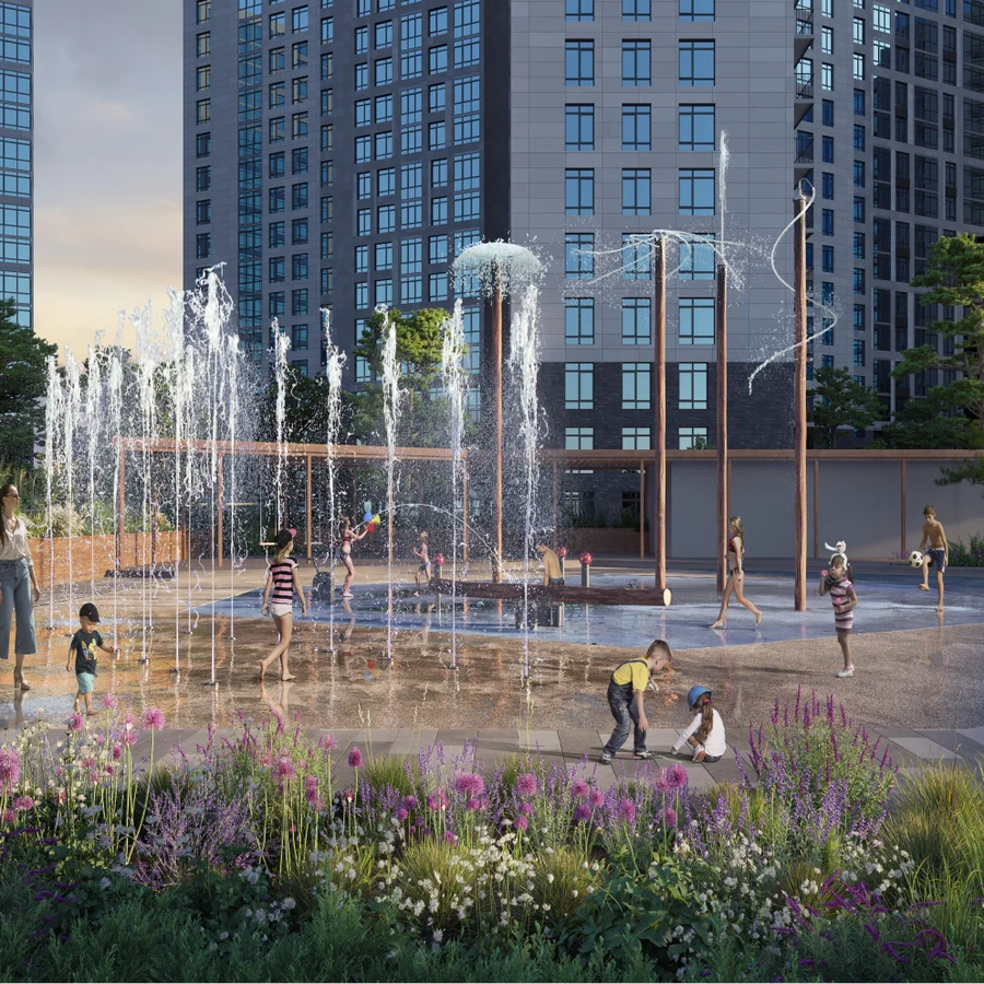 Геопластика многоуровневого ландшафта бесшовно зонирует придомовую территорию. Организация двор-парка предусматривает всевозможные сценарии времяпрепровождения. Внутреннее пространство разбито на 16 тематических площадок, подходящих под многообразные потребности и интересы жителей.